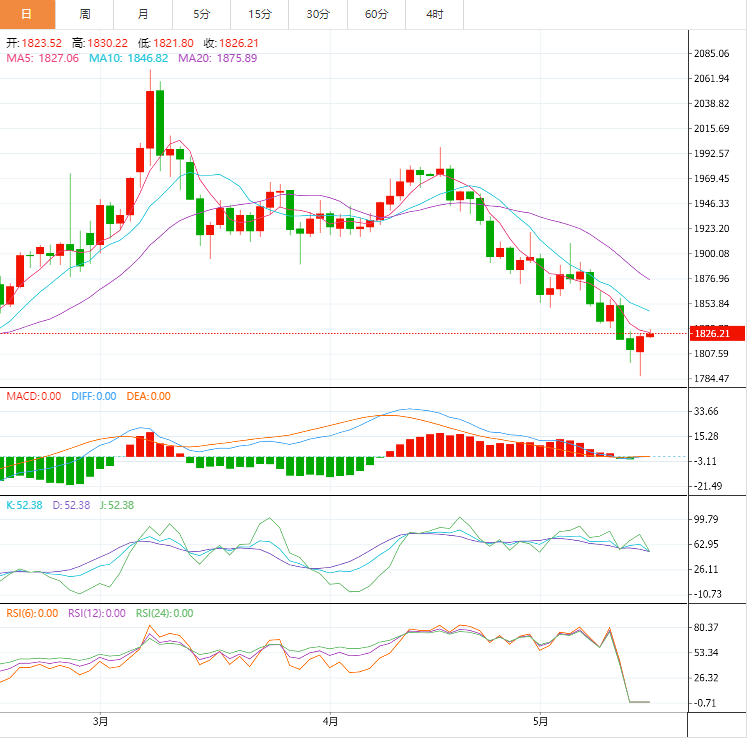 黄金价格走势综述 周三(5月18日)亚市盘初,现货黄金窄幅震荡,目前交投于1815美元附近。尽管隔夜美元延续跌势,日线录得三连阴,帮助金价一度反弹至1836附近,接近200日均线,但美国零售销售数据强劲,全球股市反弹,打压黄金的避险需求,而且美联储主席鲍威尔等官员强化激进加息的预期,令金价承压明显。金价存在