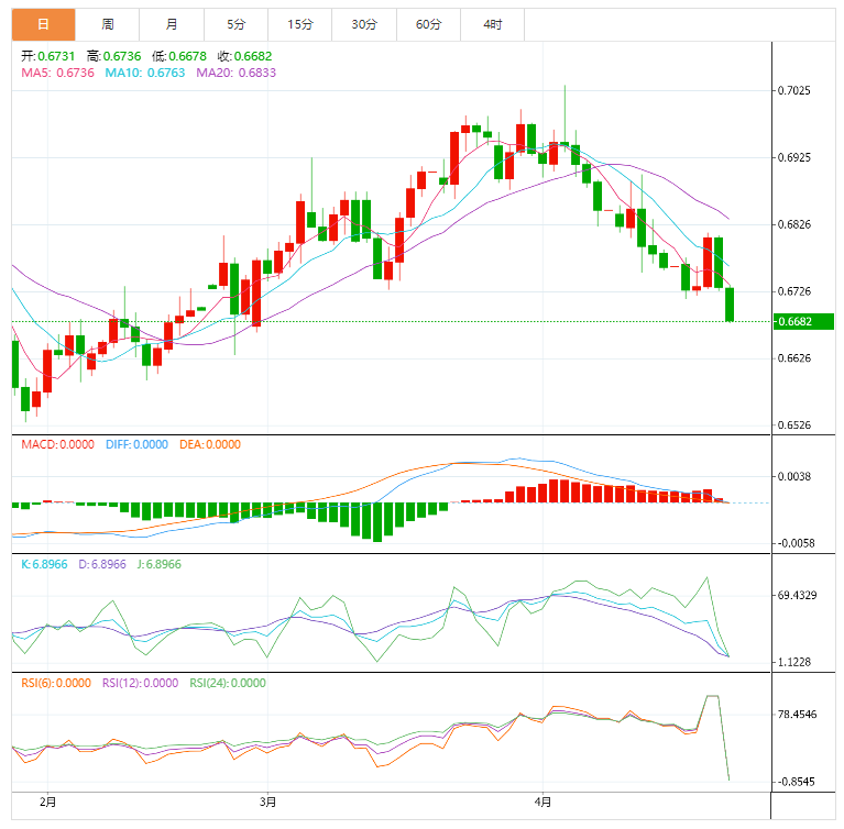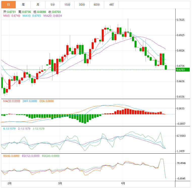 纽元兑美元未能企稳于0.6800的整数阻力位上方后自周四以来大幅回落。汇价自本周高点0.6814下跌愈1.4%,并跌破4日低点0.6715,料进一步下跌。 基本面上,纽元兑美元未能维持在1月低点0.6529至4月高点0.7035之间升势的61.8%斐波回档位0.6724上方,通常,跌破该回档位会引发汇价后市大跌。对于市场参与者来说,测试0.671