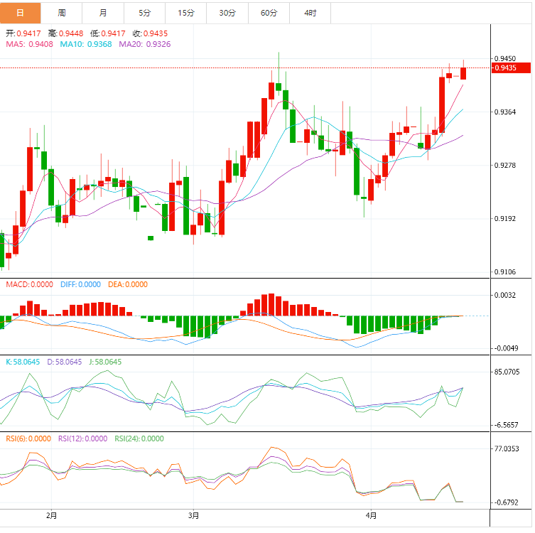 美元/瑞郎自4月14日低点0.9330出现强劲反弹后,F震荡于0.9411-0.9439小幅区间。亚市早盘美元指数疲弱,周一复活节假期美元/瑞郎表现低迷。 基本面上,美元/瑞郎正构筑看涨的三角旗形形态,这表明继强劲上涨后汇价方向不明,若继盘整后出现明确突破,则汇价有望进一步上涨。一般来说,盘整阶段是指未在价格最初反弹中