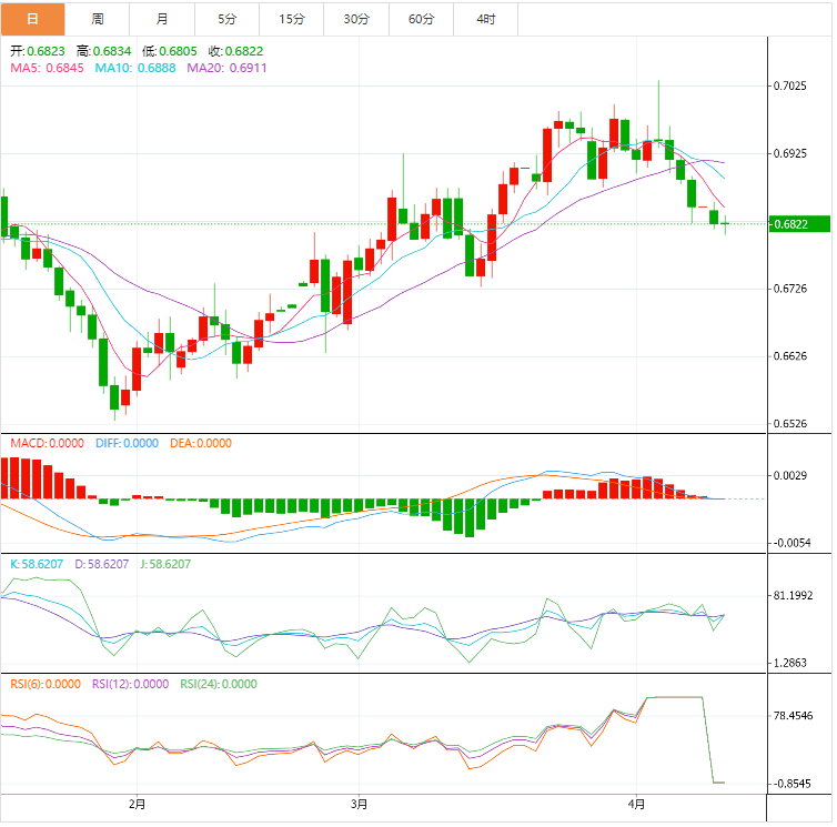 周二,在上周未能维持在心理阻力位0.7000上方后,纽元兑美元连续四天下跌。该货币对目前在周一低点0.6813附近交投,预计将延续其跌势,此前该货币对已明显跌破周一低点。 在四个小时的范围内,纽元兑美元已经跌至38.2%的斐波那契回档位(从1月的低点0.6529到3月的高点0.7035)以下,即0.6842。该指数比1月28日的最低值0