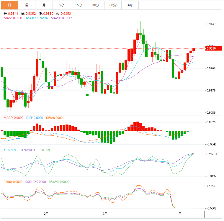 周五美元兑瑞郎延续五日连涨,已经突破周四高点0.9350。汇价自3月31日低点0.9195后强势反弹后稳固上扬。 基本面上,美元兑瑞郎在突破0.9350后录得内包线(Iidar)。汇价强势反弹后升破内包线表明看涨趋势将延续下去。自1月13日低点0.9092以来的趋势线以及3月低点0.9150将继续成功重要支撑位。汇价也从200A均线0.9
