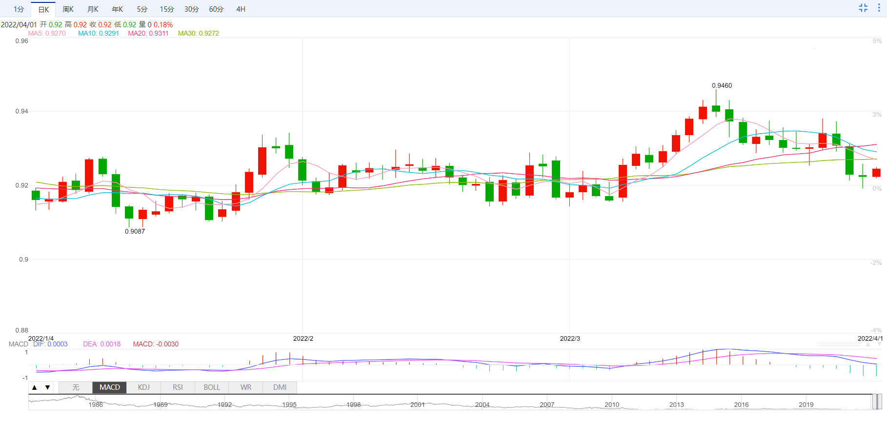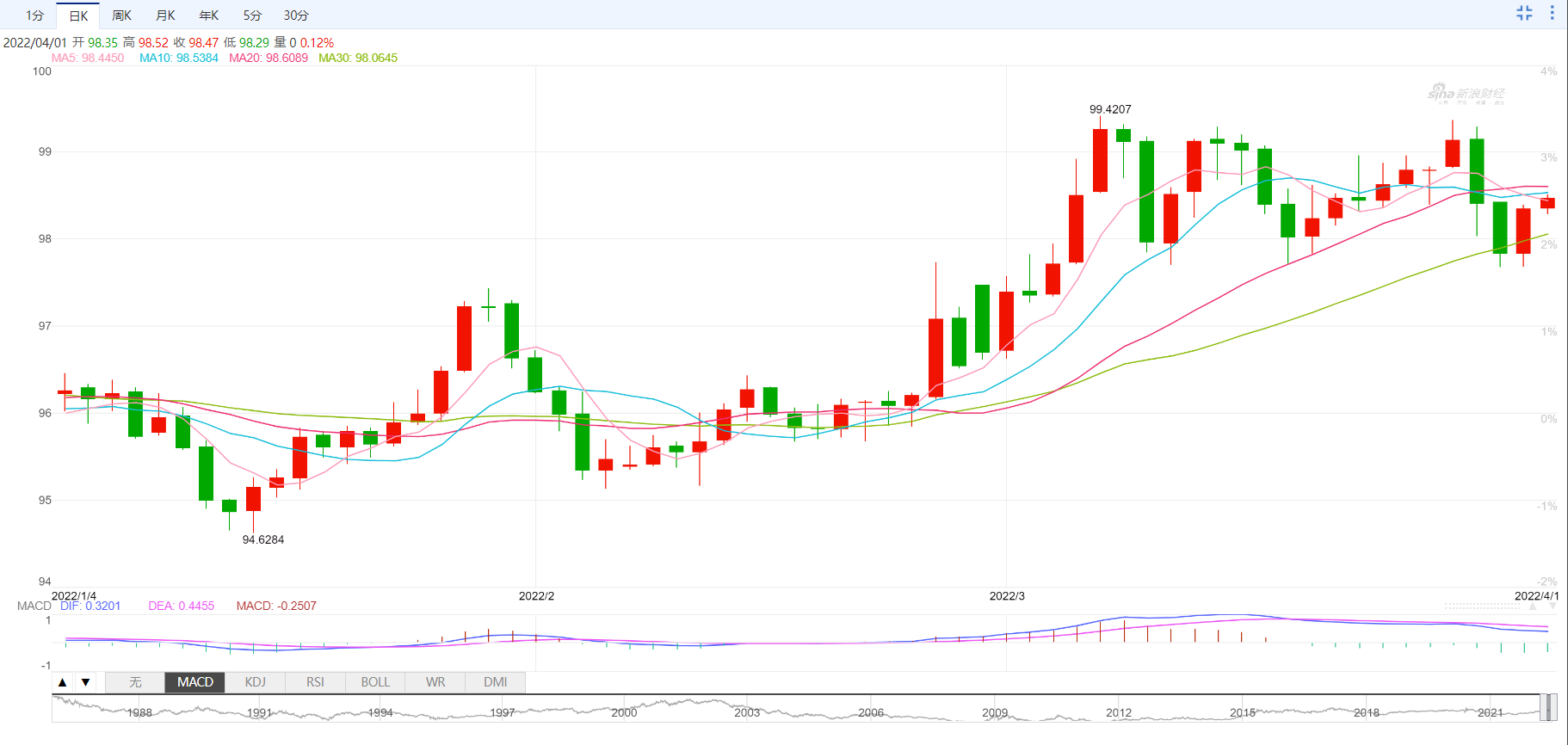 3月,美元指数以正面收盘,月度涨幅为1.65%,为2021年11月以来的最高水平。截至4月1日,美元指数位于98.348。 3月最后一个交易日的市场情绪令人沮丧。俄罗斯和乌克兰冲突未能找到一个有意义的解决方案,这让投资者保持警觉,这提振了投资前景。此外,货币市场期货预计,美联储(fd)将在5月和6月的会议上加息50个基点