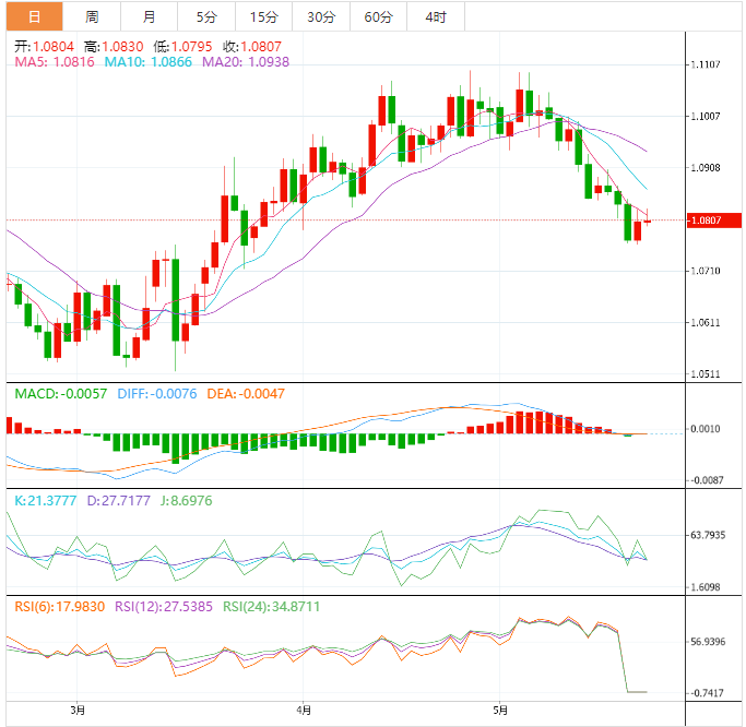 周一盘中,欧元兑美元上涨至1.0807,涨幅0.02%。 欧元基本面:上周五欧央行行长拉加德表示,需要进一步加息抑制顽固的通胀率。欧洲央行将勇敢地做出必要决议,使通胀率回到2%。欧洲央行拉加德已经确认,一次以上的加息对于缓解通胀压力是合适的。投资者应注意到,欧元区4月通胀率反弹至7%,近期食品价格下跌抑制被能