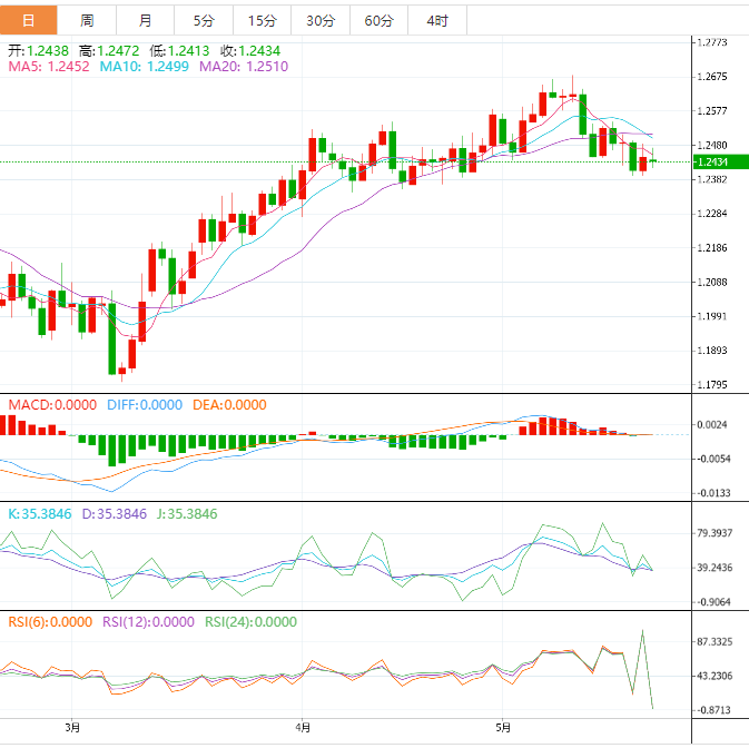 周一盘中,英镑兑美元下跌至1.2435,跌幅0.09%。 英镑基本面:美国总统拜登和众议院议员约瑟夫-麦卡锡定于週一会面,因为留给美国财政部避免违约支付的时间不到两週。英国标普採购经理人指数(I)初值公佈之前,英镑依然受到支撑。预计英国制造业I上升至48.0,而服务业I下降至55.5。 英镑技术面:英镑兑美元