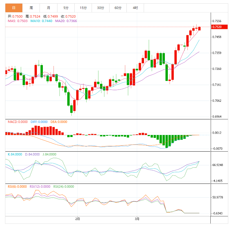 澳元兑美元在0.7515-15左右的明确方向挣扎,周一亚洲交易时段,澳大利亚和美国的债券空头争相买入。 澳元/美元汇率走势基本面解读 不仅是美国国债收益率,地缘政治担忧和来自中国的挑战也在考验澳元兑美元的价格。另外,大宗商品价格走强以及澳大利亚央行(RA)一再拒绝加息,令这对货币对的买家充满希望。 尽管
