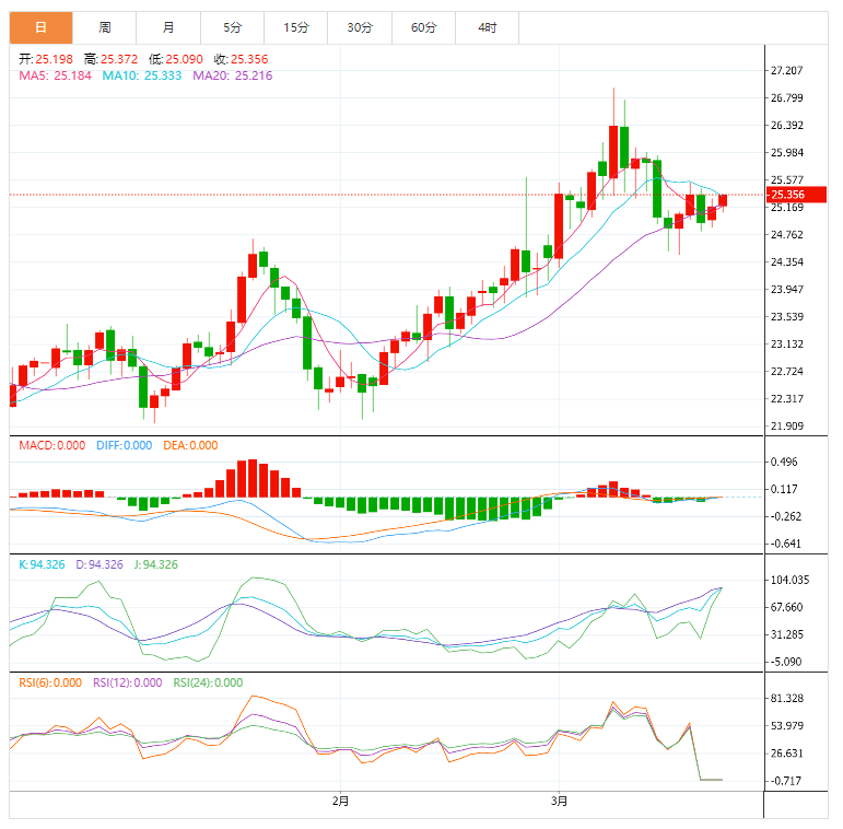 白银价格难以延续前一交易日的涨势,尽管周二盘中出现了看涨的移动平均交叉线,在25.20-30美元左右。 周一,强势白银支撑了50日移动均线穿过200日移动均线的涨势,但看涨者似乎需要得到10日移动均线25.35美元水准的确认。对上行动能构成挑战的还有看跌的ACD信号。 即便如此,相对强弱指数走强,且白银有能力维持
