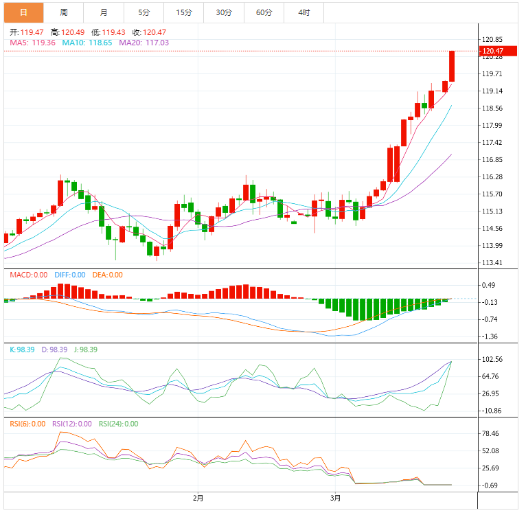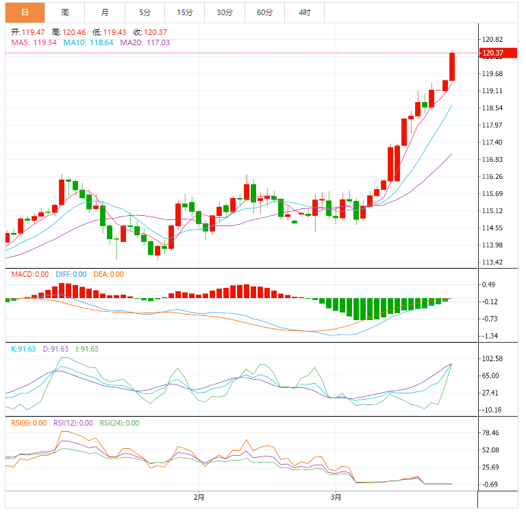 周二,美元兑日元汇价开盘于119.46附近后继续急速攀升,日内上涨近0.7%,且尚未出现疲态。值得注意的是,周二上探120.47后刷新六年高点。 基本面上,周二,日本央行(OJ)行长黑田东彦发表讲话,对消费者通胀发表一些看法。日本消费者价格指数可能会上涨,但这会导致通胀上升将对经济构成长期压力。如果日本央行决定减