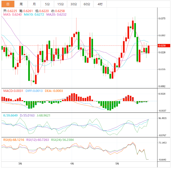 周五盘中,纽元兑美元上涨至0.6259,涨幅0.52%。 基本面上,纽元/美元突破0.6240后出现卖压。美联储主席鲍威尔讲话前,美元指数坚挺反弹,纽元/美元吸引大量卖盘。纽元/美元方面,贸易账积极,一定程度上提振纽元/美元。新西兰4月贸易帐录得4.27亿纽元,前值为-15.86亿纽元。然而,12个月贸易账录得-168亿纽元,仍接