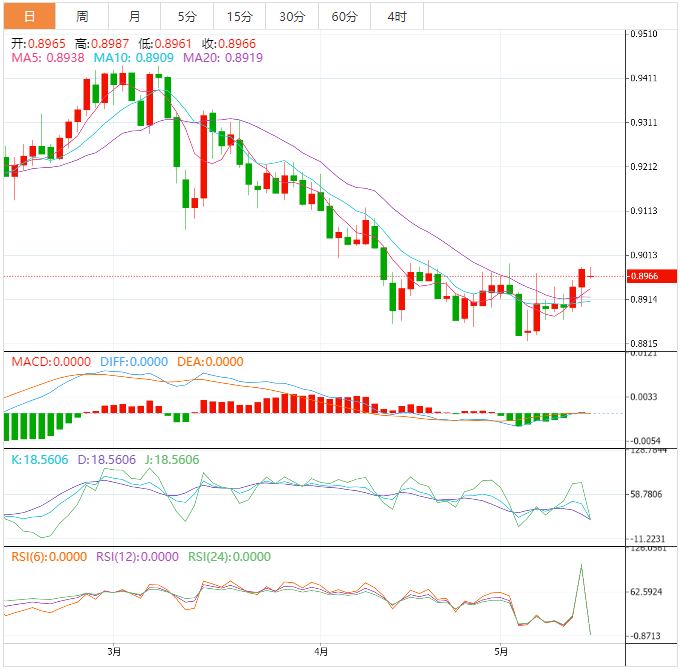 周一盘中,美元兑瑞郎下跌至0.8967,跌幅0.18%。 基本面上,美元/瑞郎正上涨接近心理阻力位0.9000。如果美元/瑞郎突破上週五的高点0.8988,则有望延续其两连涨势头。美国债务上限问题支撑避险行情,美元/瑞郎有望进一步上涨。瑞郎方面,投资者正在等待生产者和进口价格数据(4月)的公佈。生产者价格指数月率预期为-