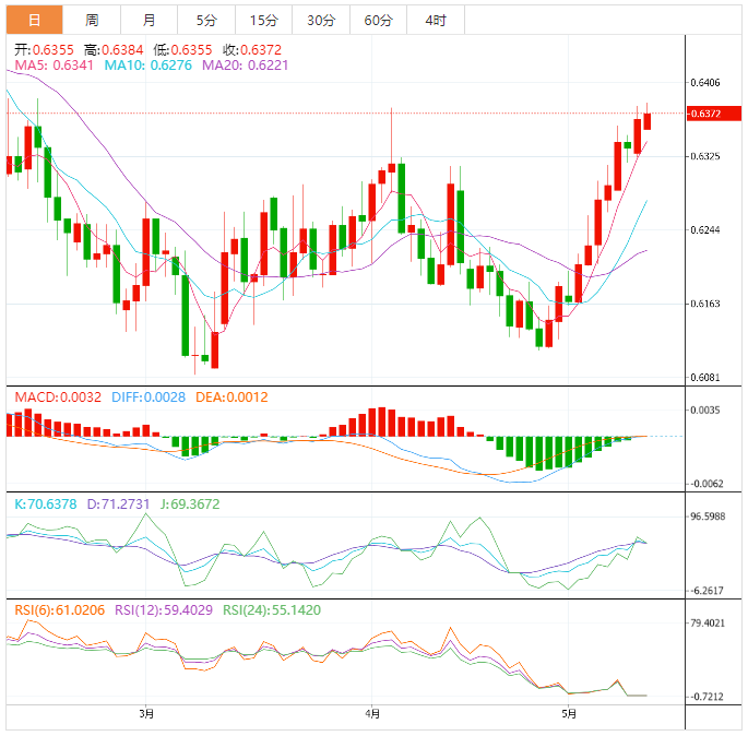 纽元兑美元从低点0.6324上涨到目前为止的高点0.6381,上涨了约0.5%。华尔街尾盘的风险再次反弹,这推动高贝塔货币走高。 澳新银行(AZak)分析师解释说,市场对4月份CI报告反应积极,因为住房通胀持续放缓,使市场不相信联邦公开市场委员会(FOC)将在6月份再次加息。 新西兰元隔夜在交叉盘和兑美元上又有了合理