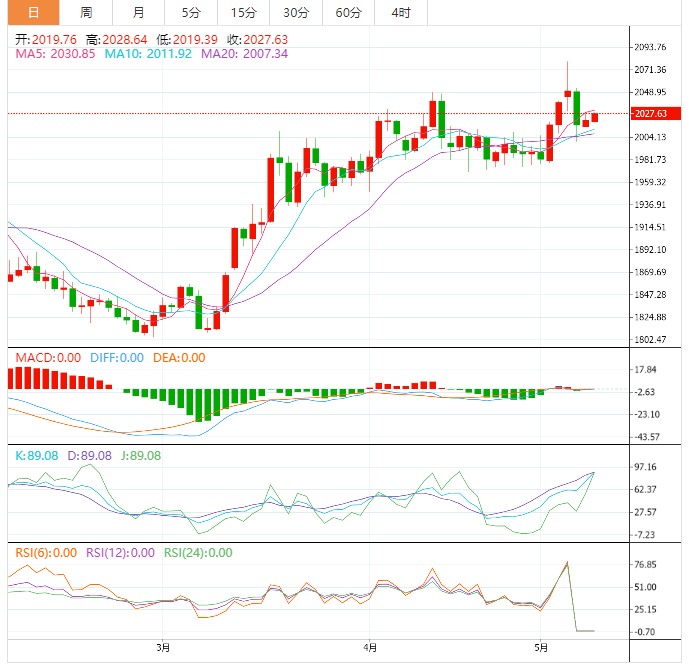 周二盘中,现货黄金小幅上涨,目前交投于2026.40美元/盎司附近,对美国债务违约危机的担忧给金价提供避险支撑。美原油窄幅震荡,目前交投于72.60美元/桶附近,在美国4月通胀数据公布前,市场仍然保持谨慎。这项通胀数据将是美联储下次利率决定的关键。 黄金交易策略 黄金价格稳定在2020.00点附近,得到A50指数的