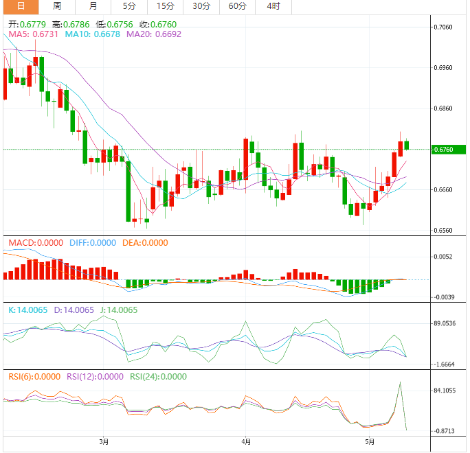周二盘中,澳元兑美元下跌至0.6761,跌幅0.29%。 澳元基本面:澳元/美元未能延续上涨突破0.6800整数关阻力后展开整理。澳元/美元上行倾向看起来很稳固,因为下跌只是一种整理,市场参与者通常认为这是一个买入机会。澳大利亚零售销售(第一季度)季度数据公佈前,澳元处于上行状态。澳大利亚零售销售(第一季度)预期
