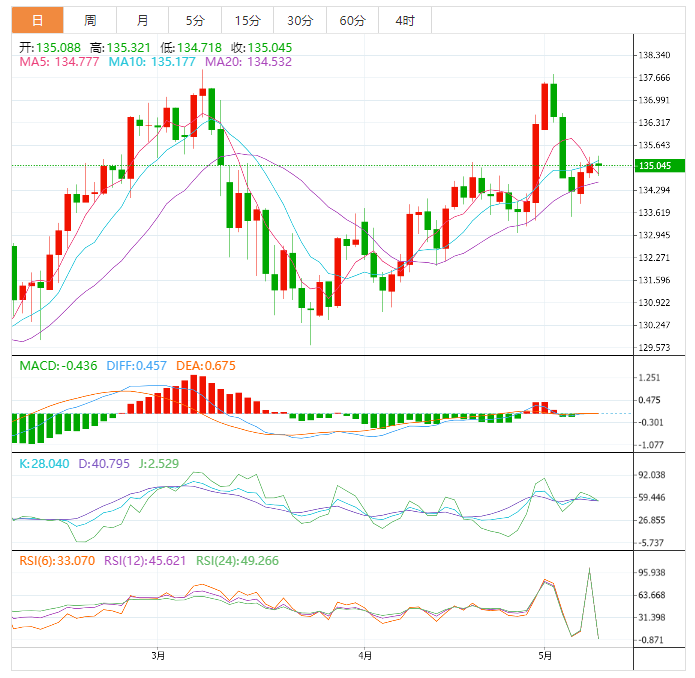 周二盘中,美元兑日元下跌至135.05,跌幅0.03%。 基本面上,美元/日元对从本周二早些时候触及的四天高点135.30-135.35附近回落,并在欧洲时段的前半段延续了其稳定的盘中跌势。不过,现货价格反弹了几个点,现在仅轻微走跌,略低于135.00心理关口。 技术面上,美元兑日元在A50附近徘徊,接近我们第一个等待的积