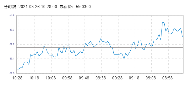 WTI原油价格实时(2021年3月26日) 名称 最新价 涨跌 涨跌幅% 开盘价 昨收价 最高价 最低价 WTI 59.14