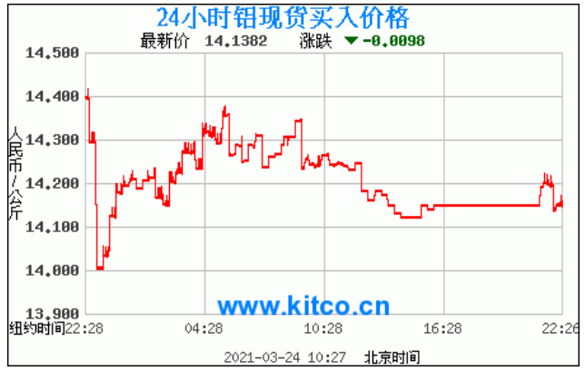 铝锭价格走势图今日最新铝锭行情(2021年3月24日) 今日最新铝锭行情:14.1382 备注:以上铝锭价格仅供参考,请以官方价格为准。