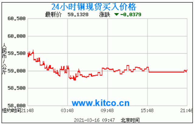 铜价格走势图今日最新铜价行情(2021年3月16日) 今日最新铜价:59.1328涨跌:-0.0379 备注:以上铜价格仅供参考,请以官方价格为准。