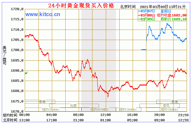 美国国债收益率在上周持续高筑后,终于出现回跌提振黄金士气,金价重新着眼于1700美元。美国众议院议长南希·佩洛西(acyloi)最新暗示,将在当地时间周三(3月11日)推出期待已久的1.9万亿美元新冠财政刺激方案,而普遍预期这是金价起涨的关键原因。 今日黄金价格走势图(2021年3月9日)
