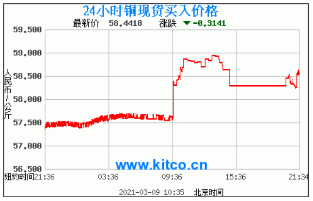 铜价格走势图今日最新铜价行情(2021年3月9日) 今日最新铜价:58.4418涨跌:-0.3141 备注:以上铜价格仅供参考,请以官方价格为准。