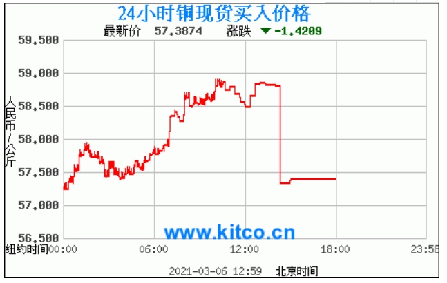 铜价格走势图今日最新铜价行情(2021年3月8日) 今日最新铜价:57.3874涨跌:-1.4209 备注:以上铜价格仅供参考,请以官方价格为准。
