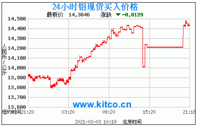 铝锭价格走势图今日最新铝锭行情(2021年3月3日) 今日最新铝锭行情:14.3846 备注:以上铝锭价格仅供参考,请以官方价格为准。