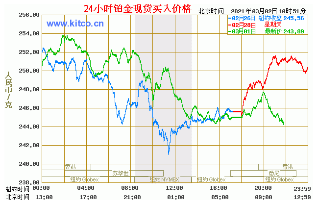 铂金价格走势图今日最新铂金行情(2021年3月2日) 今日最新铂金行情:243.89 备注:以上铂金价格仅供参考,请以官方价格为准。