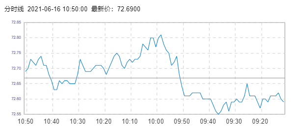WTI原油价格实时(2021年6月16日) 名称 最新价 涨跌 涨跌幅% 开盘价 昨收价 最高价 最低价 WTI 72.71