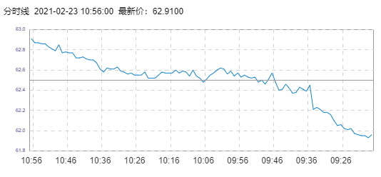 WTI原油价格实时(2021年2月23日) 名称 最新价 涨跌 涨跌幅% 开盘价 昨收价 最高价 最低价 WTI 62.89