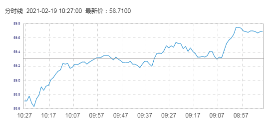 WTI原油价格实时(2021年2月19日) 名称 最新价 涨跌 涨跌幅% 开盘价 昨收价 最高价 最低价 WTI 58.70