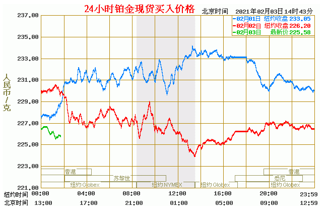 铂金价格走势图今日最新铂金行情(2021年2月3日) 今日最新铂金行情:225.58 备注:以上铂金价格仅供参考,请以官方价格为准。