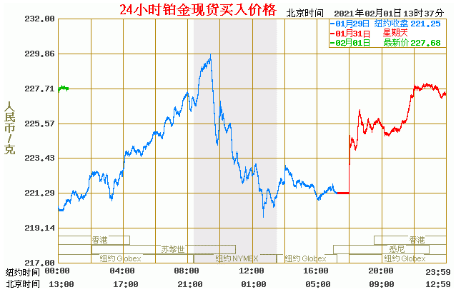 铂金价格走势图今日最新铂金行情(2021年2月1日) 今日最新铂金行情:227.68 备注:以上铂金价格仅供参考,请以官方价格为准。