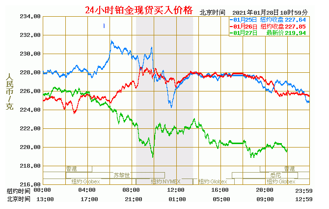 铂金价格走势图今日最新铂金行情(2021年1月28日) 今日最新铂金行情:219.94 备注:以上铂金价格仅供参考,请以官方价格为准。