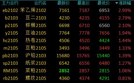 1月26日消息国内期货市场开盘,商品期货涨多跌少,苯乙烯涨超3%,豆二、棕榈涨超2%,豆油、热卷、纸浆涨超1%;焦炭、焦煤、沪镍、沪锌跌超1%。