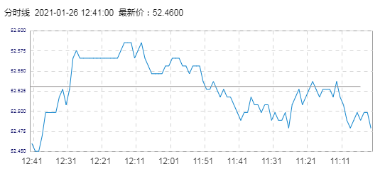 WTI原油价格实时(2021年1月26日) 名称 最新价 涨跌 涨跌幅% 开盘价 昨收价 最高价 最低价 WTI 52.46