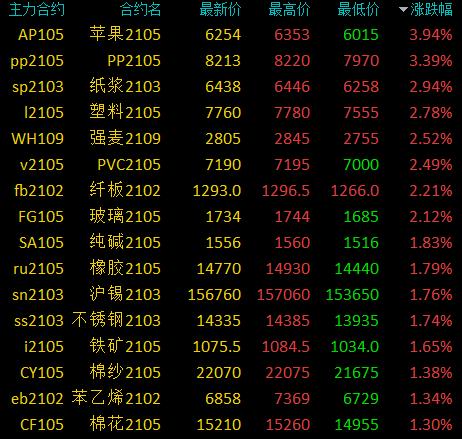 1月18日消息国内期货市场收盘,商品期货涨跌参半。苹果、涨逾3%,塑料、VC等等涨逾2%,纯碱、R等涨超1%,沪镍、螺纹等小幅上涨;LG跌超5%,尿素跌超3%,原油跌逾2%,TA、焦炭等跌超1%,焦煤、硅铁等小幅下跌。