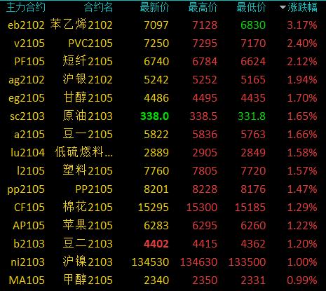 1月19日消息国内期货市场开盘,商品期货多数上涨,能源化工领涨,苯乙烯、VC等涨超2%,塑料、等涨超1%,纯碱、玻璃等小幅上涨;焦炭、郑煤跌超2%,焦煤、螺纹、鸡蛋等小幅下跌,纸浆、LG、生猪等小幅下跌。