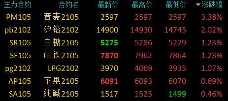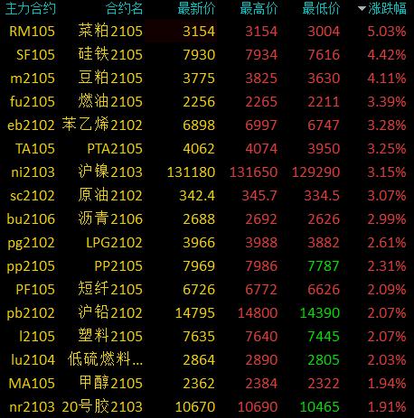 1月13日消息国内期货市场收盘,商品期货多数收涨,农产品(6.19-4.03%,诊股)涨幅居前,菜粕涨停创新高,涨幅5.03%,豆粕涨超4%,硅铁、燃油、苯乙烯、沪镍涨超3%,沥青、LG、涨超2%,沪银、橡胶、塑料、棉纱、VC涨超2%。能源板块大跌,焦煤跌超5%,焦炭跌超2%。