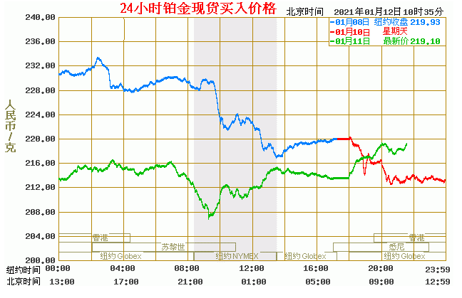 铂金价格走势图今日最新铂金行情(2021年1月12日) 今日最新铂金行情:219.10 备注:以上铂金价格仅供参考,请以官方价格为准。