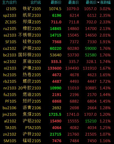 1月8日消息国内期货市场开盘,商品期货多数上涨,铁矿涨超3%,纸浆、郑煤等涨逾2%,热卷、螺纹等涨超1%,苹果、玉米、淀粉等小幅上涨;VC跌超1%,、塑料等小幅下跌。生猪期货今日挂牌上市,开盘跌逾3%。 市场如何看待今年9月的生猪价格?生猪期货上市后对产业风险管理将发挥怎样的作用?相关部