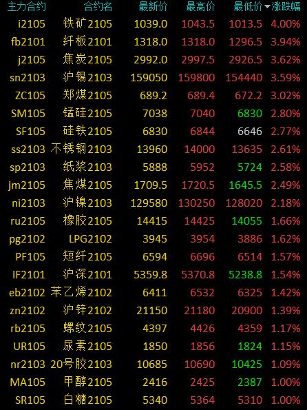 1月5日消息国内期货市场收盘,商品期货多数上涨,黑色系领涨,铁矿石涨4%,焦炭、沪锡等涨逾3%,焦煤、郑煤等涨超2%,橡胶、螺纹等涨超1%,热卷、TA等小幅上涨;苹果、LU、燃油等跌超2%,鸡蛋、沥青等跌超1%,玻璃、豆油等小幅下跌。