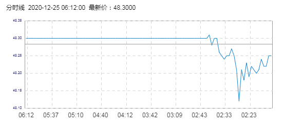 WTI原油价格实时(2020年12月25日) 名称 最新价 涨跌 涨跌幅% 开盘价 昨收价 最高价 最低价 WTI 48.30