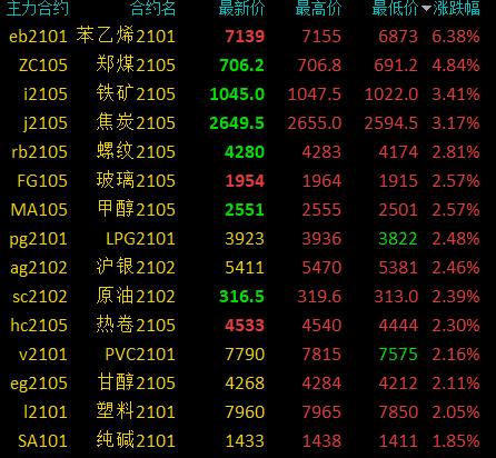 国内期货市场开盘,商品期货多数上涨,苯乙烯涨超5%,郑煤涨超4%,沪银、焦炭等涨超2%,白糖、纯碱等涨逾1%,郑棉、豆油等小幅上涨;仅豆二、豆粕等少数品种小幅下跌。