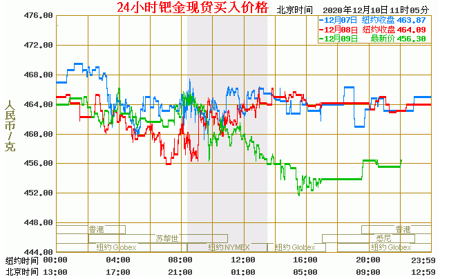 钯金价格走势图今日最新钯金行情(2020年12月10日) 今日最新钯金行情:456.30 备注:以上钯金价格仅供参考,请以官方价格为准。