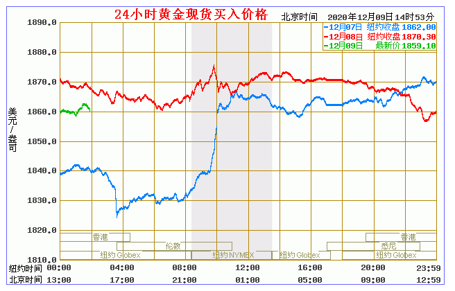 周三(12月9日)亚市午间,现货黄金短线下挫近5美元,最低至1855.79美元,现报1860.06美元/盎司,日内跌幅0.56%。但投资人仍密切关注围绕美国财政刺激计划的发展,目前市场预期比较乐观;考虑到欧洲央行的扩大宽松前景,金价仍留有震荡走高的机会。 今日黄金价格走势图(2020年12月9日)