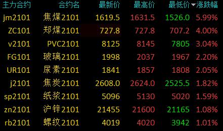 12月9日讯国内期货市场收盘,商品期货多数下跌,煤炭板块强势上涨,焦煤涨近6%,动力煤涨停,涨幅4.00%,VC涨超3%,玻璃、尿素涨超2%。焦炭、螺纹、热卷、纸浆涨超1%。LG、橡胶、R跌超4%,、纯碱、苹果跌超3%,硅铁跌超2%,原油、白糖、燃油跌超1%。