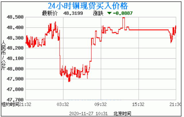 铜价格走势图今日最新铜价行情(2020年11月27日) 今日最新铜价:48.3199涨跌:-0.0887 备注:以上铜价格仅供参考,请以官方价格为准。