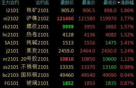 11月27日讯国内期货市场开盘,商品期货多数上涨,沪镍、螺纹、热卷涨逾1%。低硫燃料油跌近2%,、甲醇、沥青等跌超1%。