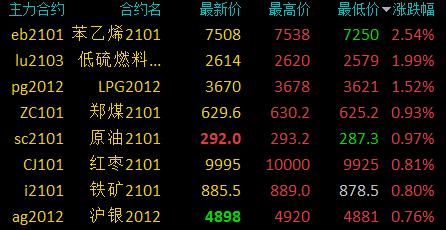11月26日讯国内期货市场开盘,商品期货多数上涨,苯乙烯涨逾2%,燃油、LG涨逾1%;甲醇、VC、豆二、塑料等跌超1%。