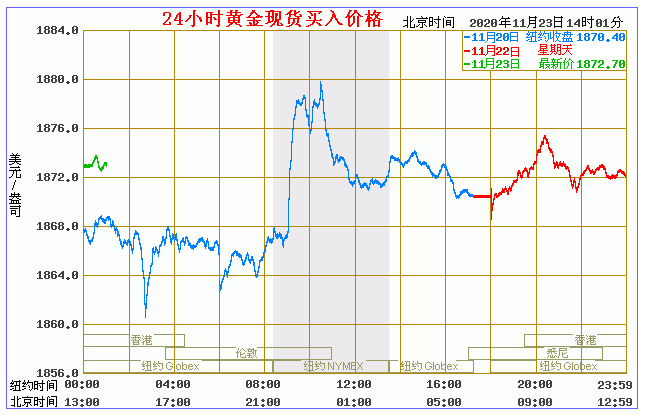 (2020年11月23日)国际黄金价格表 名称 最新价 涨跌 涨跌幅% 买价 卖价 开盘价 昨收价 最高价 最低价