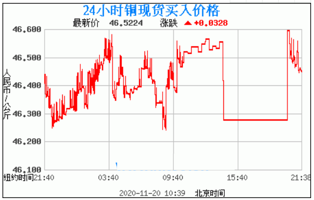 铜价格走势图今日最新铜价行情(2020年11月20日) 今日最新铜价:46.5224涨跌:0.0328 备注:以上铜价格仅供参考,请以官方价格为准。