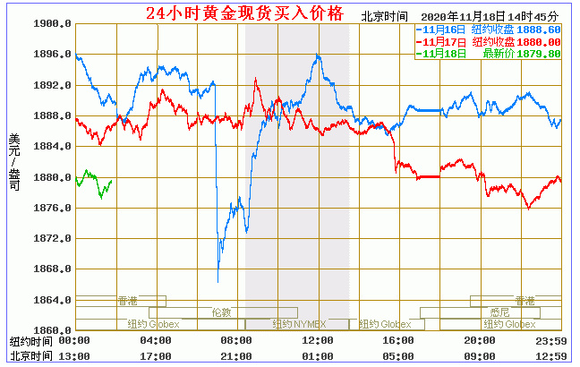 (2020年11月18日)国际黄金价格表 名称 最新价 涨跌 涨跌幅% 买价 卖价 开盘价 昨收价 最高价 最低价